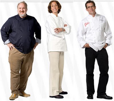 Tasters are former contestants in the Masters series, along with the usual bevy of critics. Ohhhhh, Ludouche is back! Glee, glee, glee! First up to serve is Art Smith. Former dish: chopped sirloin with green peppercorn sauce and fried egg. New interpretation: ground lamb scotch egg, sweet potato fries and tomato tart. It is well received and seems to capture Art well. Rick is next. Former dish: fennel balsamic quail with mosto cotto mostarda, sauteed greens and roasted apples. New interpretation: quail with parsnip and prosciutto stuffing over wild greens. The critics note that he did not go Mexican and Ludouche says it is balanced and a great dish (!!). Suzanne is up. Former dish: seared grouper with hearts of palm, trumpet mushrooms and meyer lemon zest. New interpretation: roast grouper with gnocchi, peas, bacon and parsnips. The critics notice that the dish appears to have gone too long before being served. Hubert is up. Former dish: seared scallops with potato puree and bacon, sea urchin and mustard greens. New interpretation: seared scallop with cream of sea urchin over fingerling mashed potatoes. Scallops are perfectly cooked but the critics aren't tasting the sea urchin. Michael's up. Former dish: rack of lamb and black pasilla chile with mission figs. New interpretation: rack of lamb stuffed with fig mostarda, chickpeas and fried rosemary. Overall, critics feel the dish is not complete. Anita is next. Former dish: lobster and truffle cappuccino with a corn madeleine. New interpretation: corn chawanmushi, champagne gelee, lobster biscuit sandwich. Critics are impressed with the thought that went into the dish.