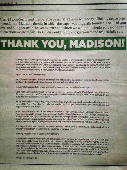 What started in Madison ended in Madison recently as satirical provocateurs The Onion stopped print publication in the very city where the sardonic paper was started 25 years ago. This being The Onion, of course, they elected to go out with an editorial blaze of glory.