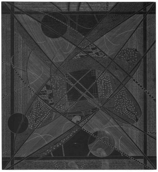 The smaller-scale works by Tegland contain his process through intricate renderings of organic forms. His work as a museum preparator influences his discerning intimacy with each line and shape. The panels are arranged in sets of three and their poetic aura bring to mind the literary convention of tercets, three-line stanzas that emanate rhythmically, sometimes rhyming, resulting in a momentum that is lyrical and succinct. Terms, Sincerely L. Cohen and Bird’s High are one set of three panels hanging together and are akin to this three-line poetry form. These three pieces hanging together are much like a stanza with the rhythmic, repeating forms evoking a cadence like visual rhymes.