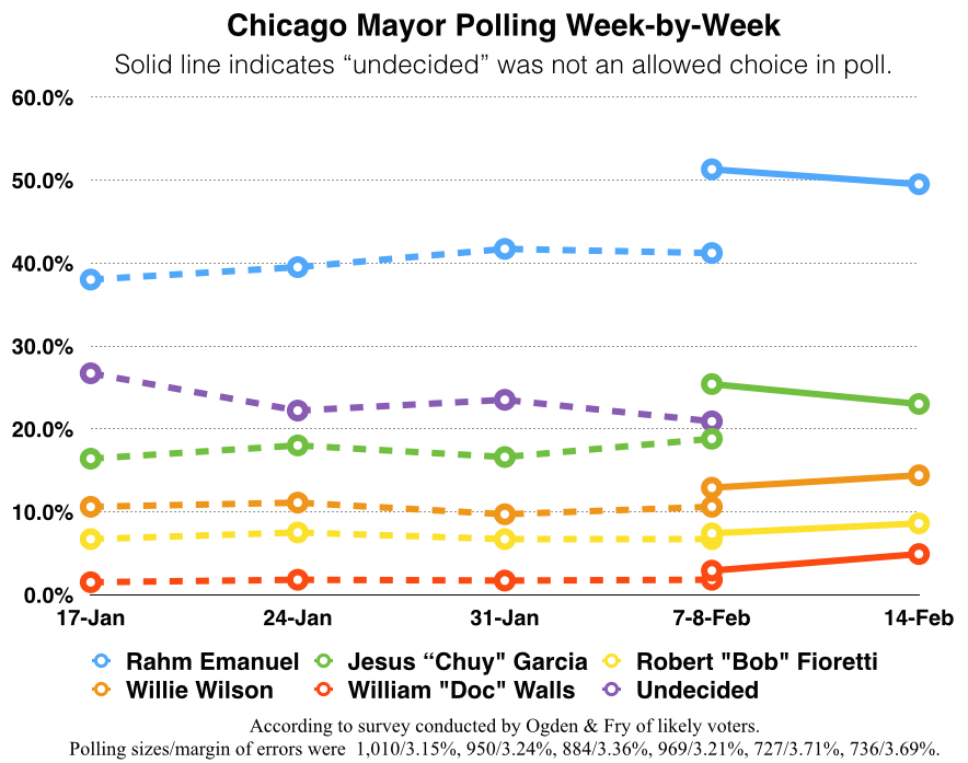 The other notable ongoing development with these polls are the percentage of undecided voters remaining as the mayoral race heads into its final days. The Ogilvie & Fry survey stopped tracking undecideds as early voting has begun, but the Tribune poll shows 20 percent of those surveyed still haven't made up their minds. So while there's still a strong "anyone but Rahm" sentiment out there, the other contenders haven't done much to sway undecided voters their way.
